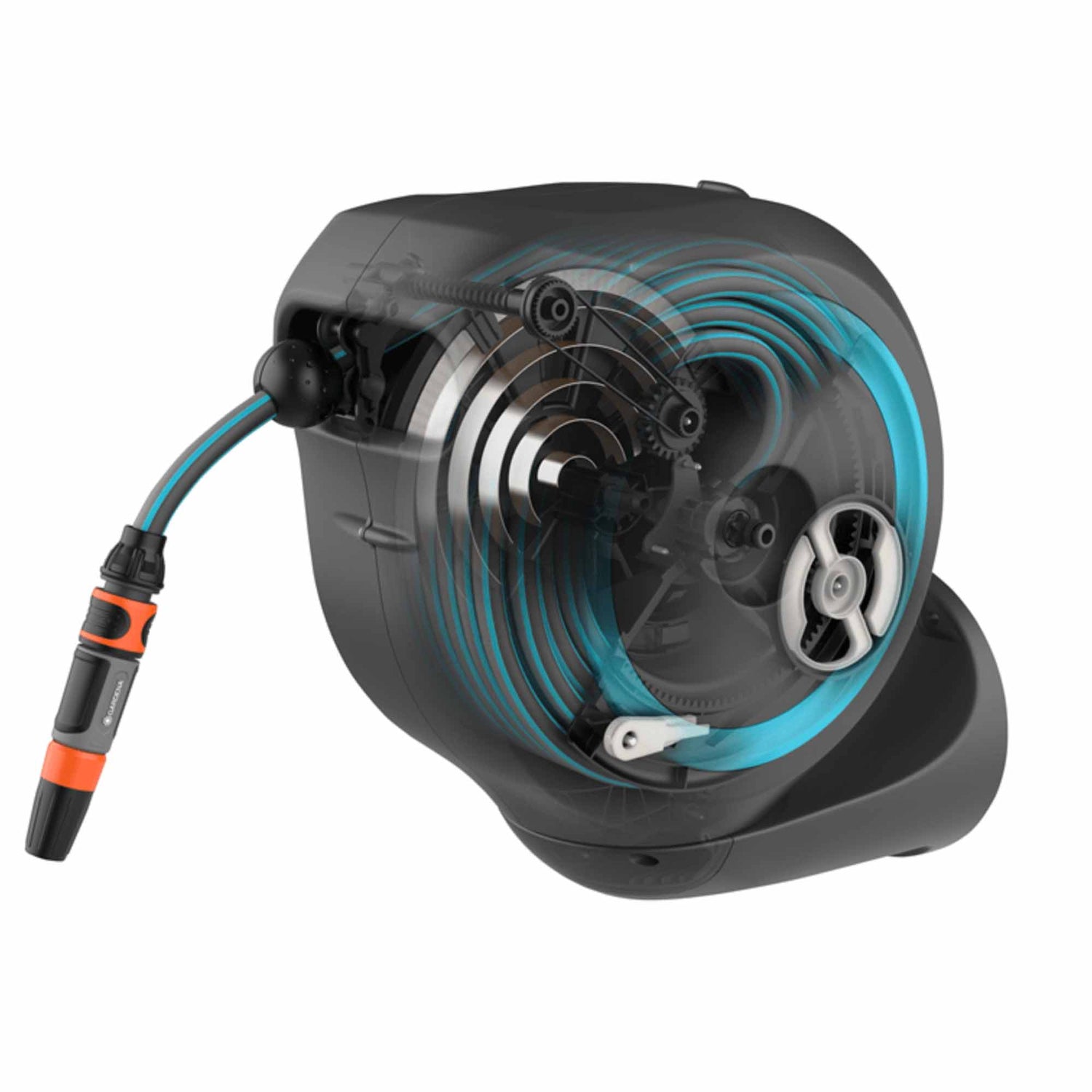 Automatic retractable: Thanks to the integrated steel spring and RollControl technology, the hose rewinds smoothly and in a controlled manner with a light pull.