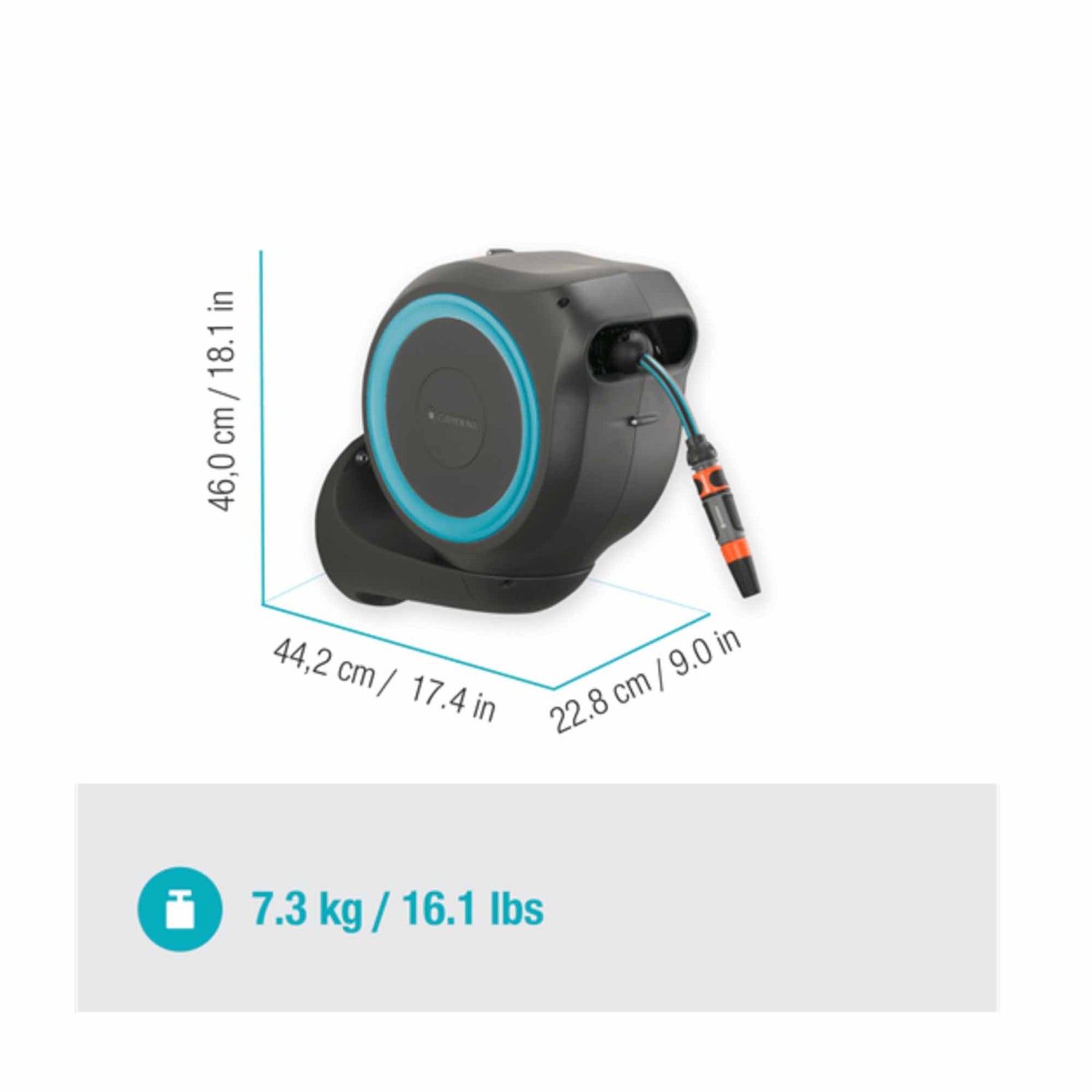 Weather resistance: Made of UV and frost resistant materials, the hose reel can remain installed outside all year round.