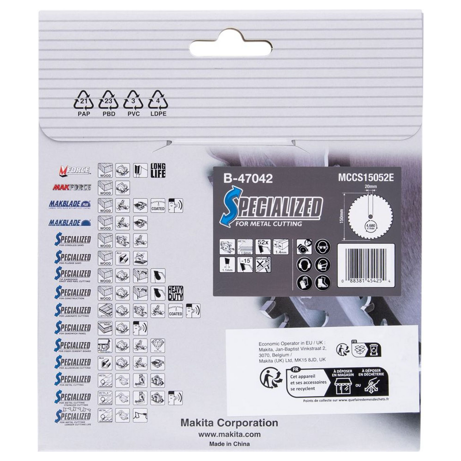 • 1 Makita B-47042: lama per sega circolare Specialized T.C.T 150mm 52 denti per taglio metallo.